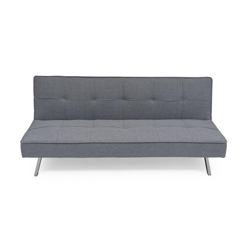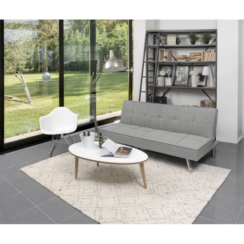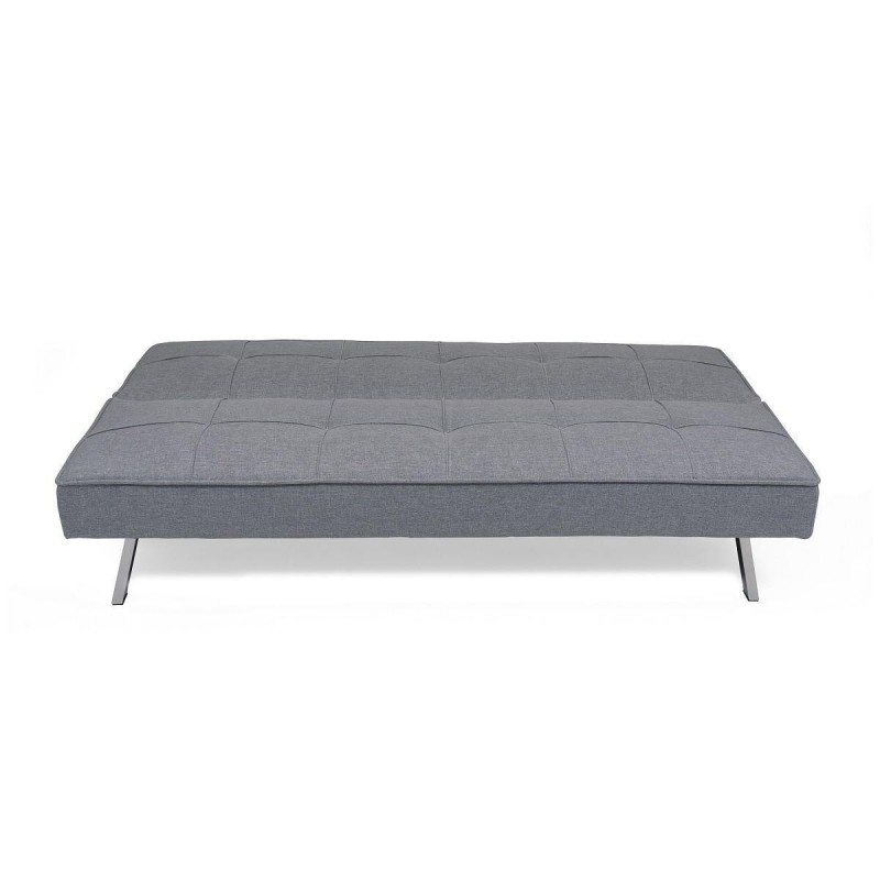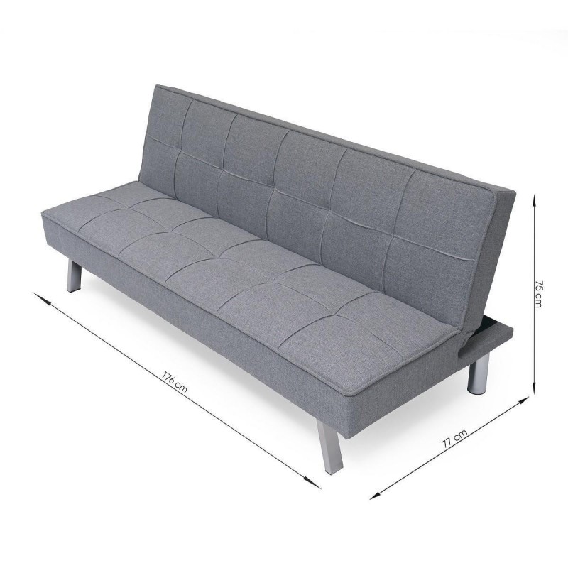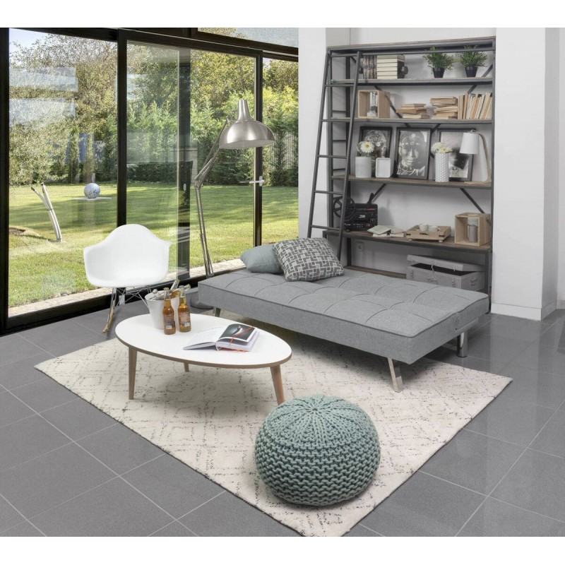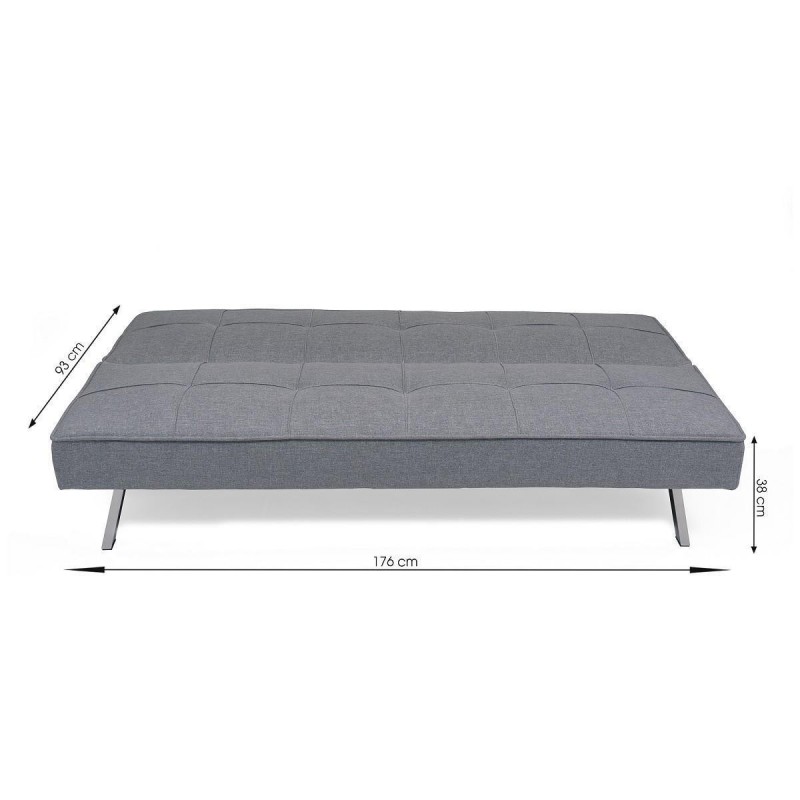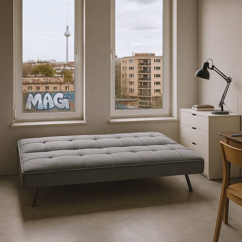 Está tapizado en tela color gris con efecto capitoné, un diseño que aúna lo clásico y la vanguardia para conseguir un sofá cama único.