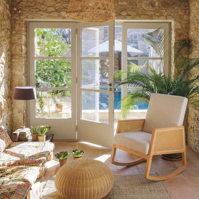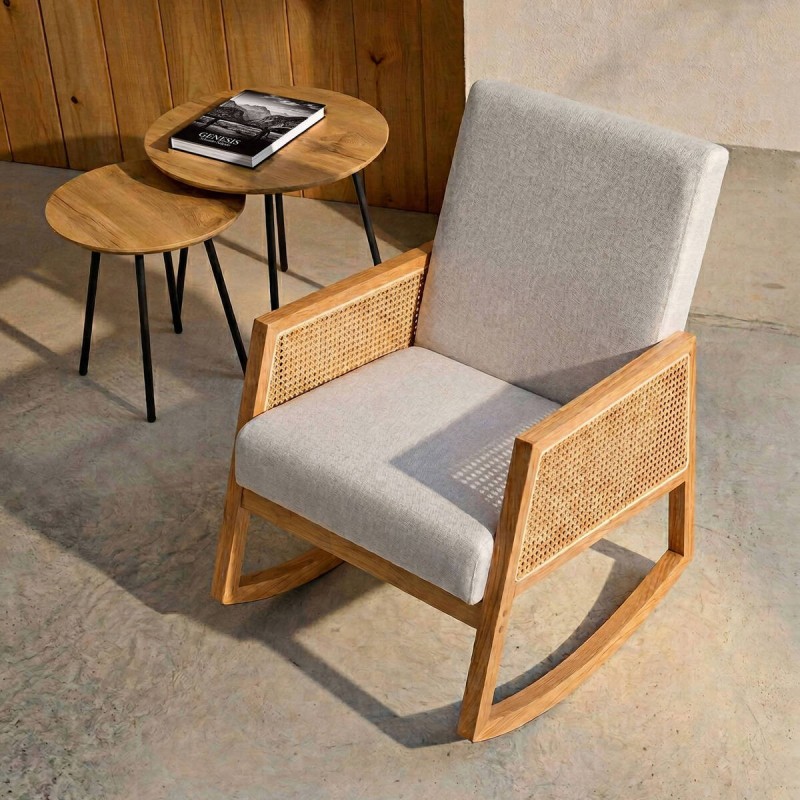 Convierte cualquier rincón en un espacio de calma y estilo con esta elegante butaca mecedora de diseño nórdico. Su combinación de madera natural, rejilla tipo ratán y tapizado en tono neutro crea una pieza única que equilibra confort, funcionalidad y estética.