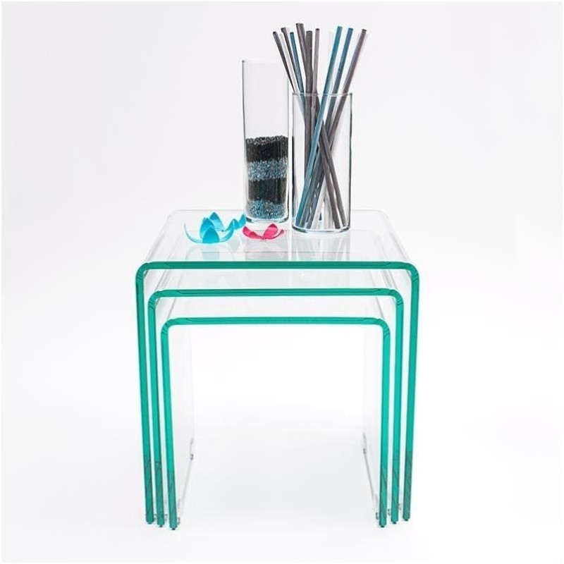 Un conjunto de 3 mesas auxiliares de cristal curvado y templado de 12 mm de grosor tipo nido.
