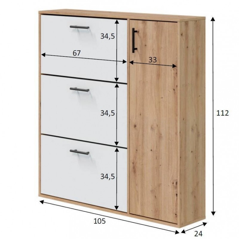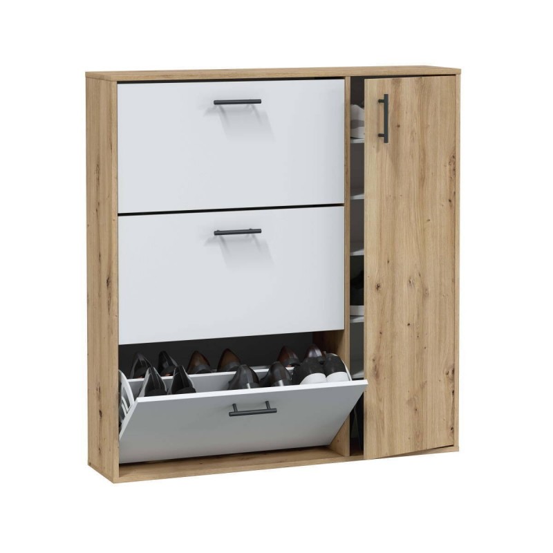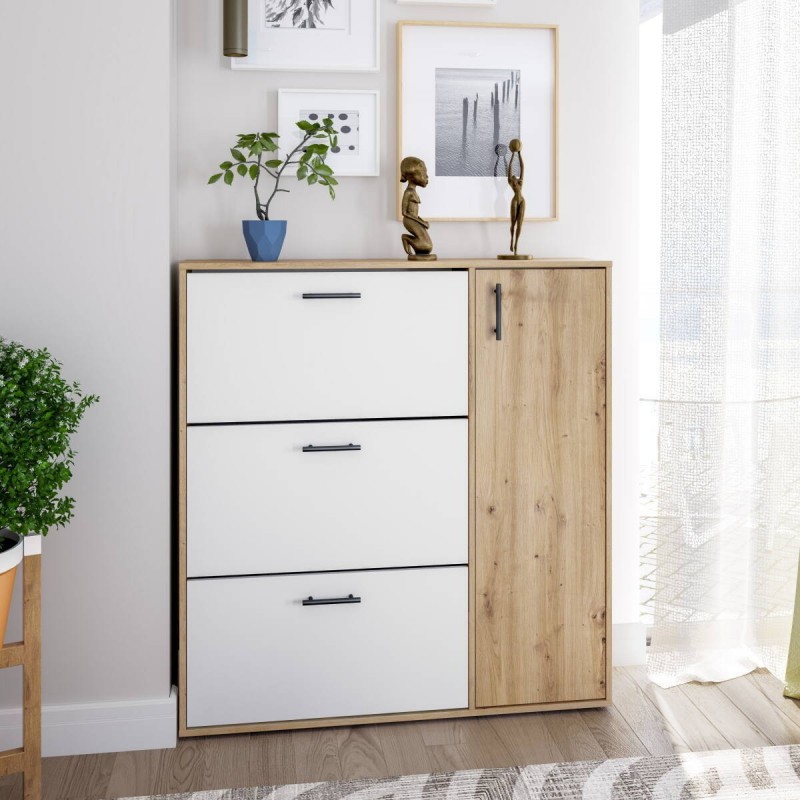 Moderno mueble zapatero con 4 puertas (3 abatibles + 1 lateral) y 5 estantes interiores, ideal para almacenar hasta 24 pares de zapatos.