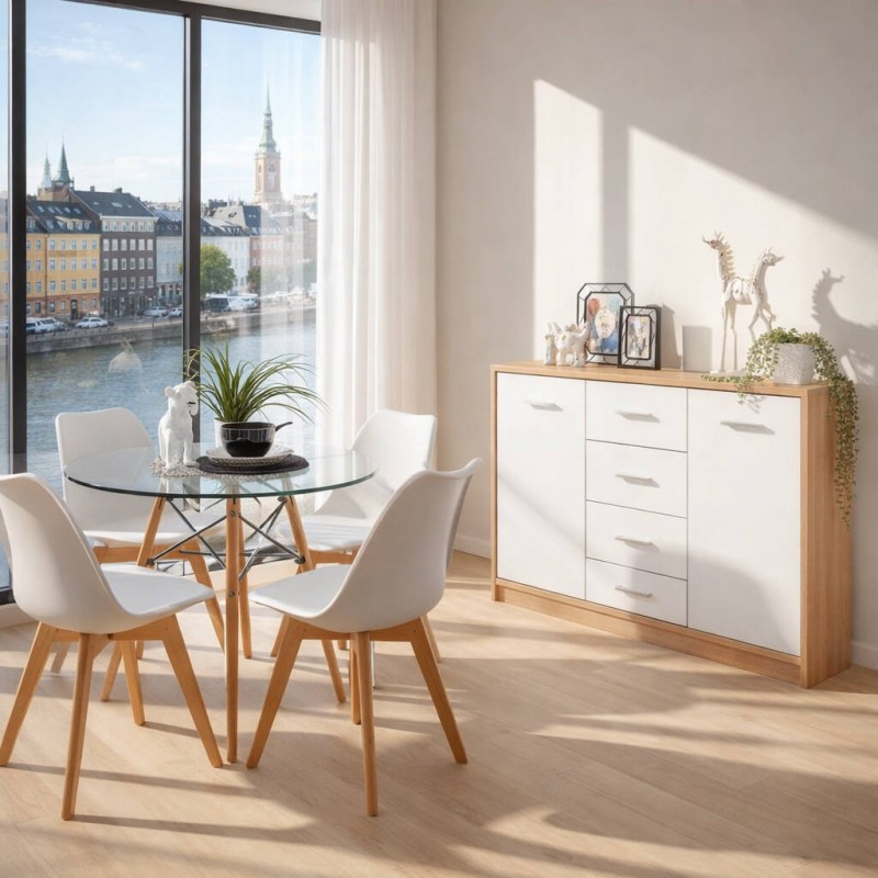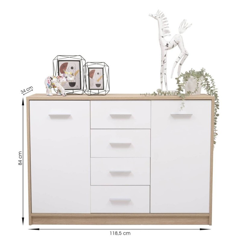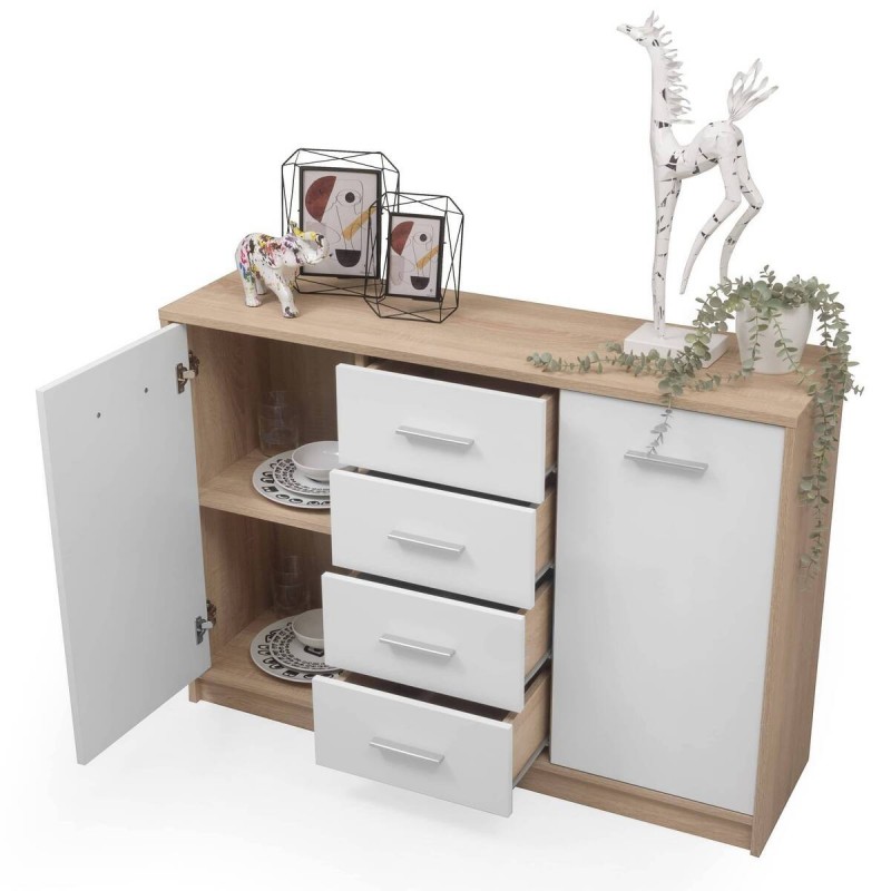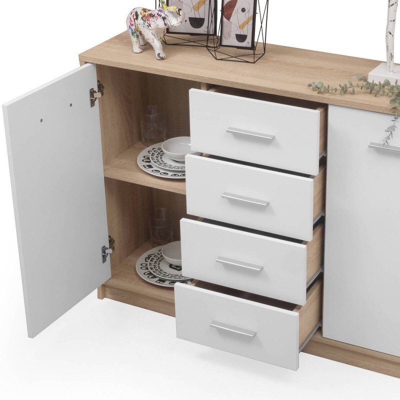 El aparador KENTO cuenta con cuatro amplios cajones centrales y dos huecos con balda y puertas en los laterales, para que puedas disponer de espacio de almacenaje extra en tu comedor o salón para organizar mejor tus enseres.