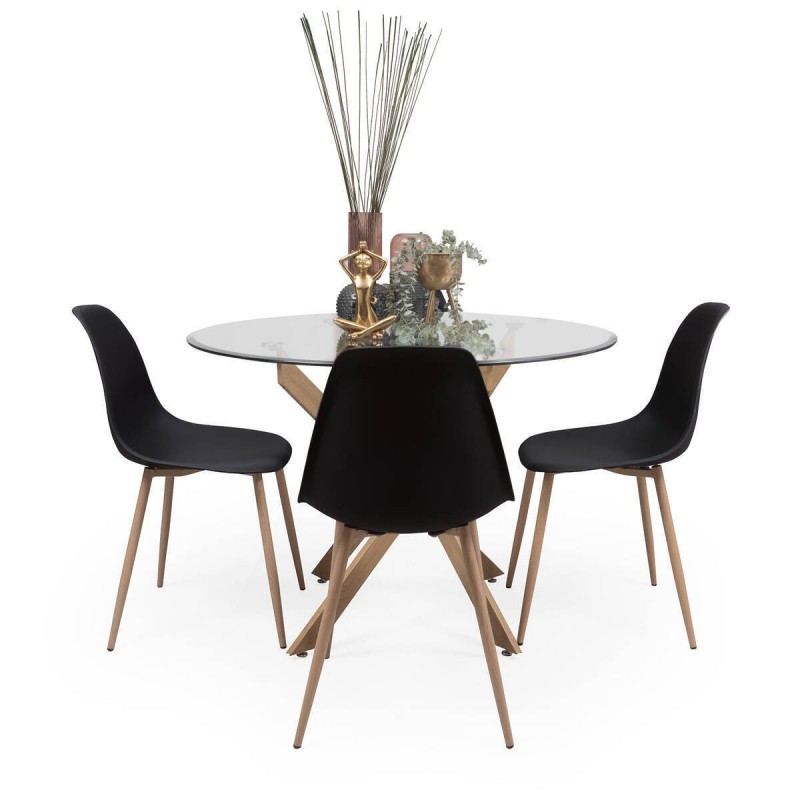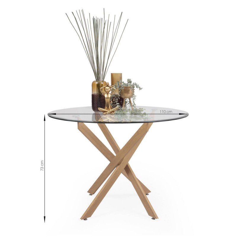 La mesa de comedor DALILA destaca por la originalidad de su diseño. Es una mesa de comedor de cristal redondo de 110 cm de diámetro y 10 mm de grosor, con una base metálica en acabado imitación madera que juega con las formas curvas, dotándola de una estética suave y acogedora.